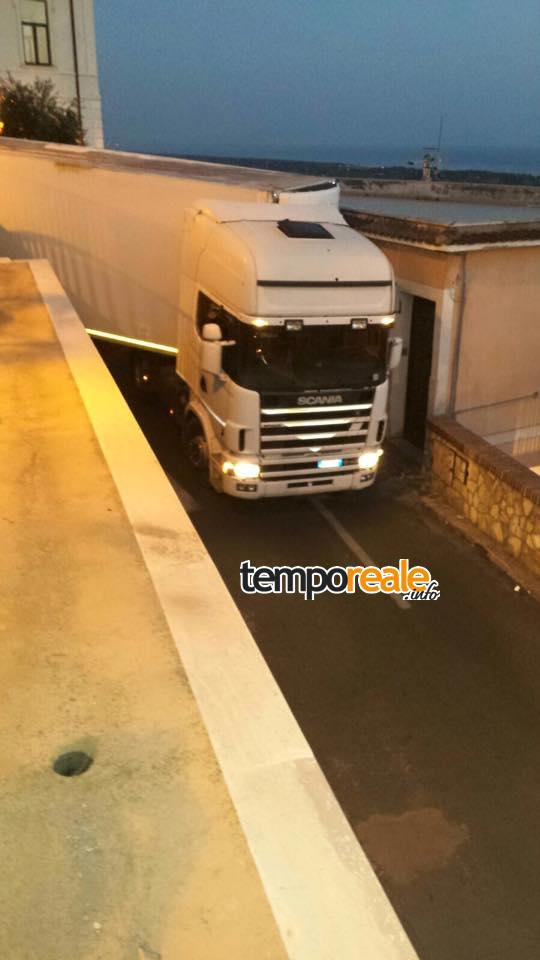 Minturno / Tir incastrato in Via Principe di Piemonte: caos nel centro storico